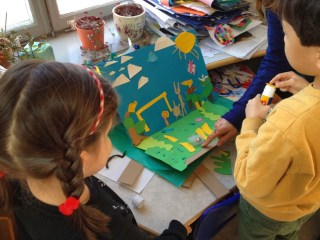 A primeira ‘aula’ foi no dia 17 de março. Comecei a oficina mostrando algumas ilustrações minhas e um roughs que fiz para um trabalho que estou desenvolvendo no momento. A professora, Miss White, sugeriu que trabalhássemos com uma fábula bem conhecida pelas crianças: O Coelho e a Tartaruga (The hare and the tortoise ). A intenção é fazermos um pequeno livro com poucas páginas. Cada página contemplará uma técnica diferente. Também temos a intenção de fazer as contracapas (capas 2 e 3) marmorizadas. Estou ansiosa para ver o resultado!
