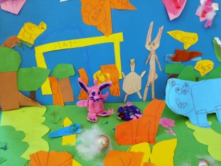 Na segunda feira seguinte, no dia 24, fizemos a revisão do nosso storyboard e passamos à execução do cenário (background). Cada criança realizou uma parte do cenário. Ficaram tão entusiasmadas com o trabalho, que o cenário acabou ficando repleto de flores, arbustos, árvores, animais (até um hipopótamo passou a fazer parte da história! Amei!), borboletas, flores, etc… Abaixo o resultado do cenário e uma imagem finalizada por uma das alunas.
