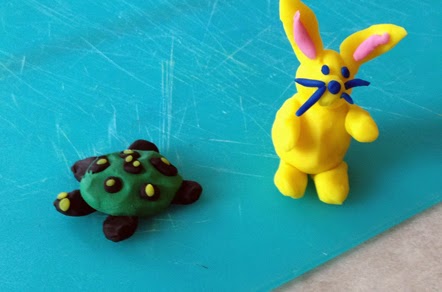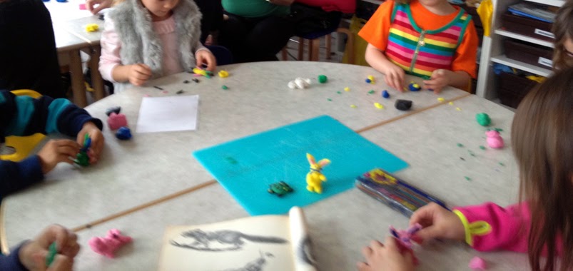 A primeira ‘aula’ foi no dia 17 de março. Comecei a oficina mostrando algumas ilustrações minhas e um roughs que fiz para um trabalho que estou desenvolvendo no momento. A professora, Miss White, sugeriu que trabalhássemos com uma fábula bem conhecida pelas crianças: O Coelho e a Tartaruga (The hare and the tortoise ). A intenção é fazermos um pequeno livro com poucas páginas. Cada página contemplará uma técnica diferente. Também temos a intenção de fazer as contracapas (capas 2 e 3) marmorizadas. Estou ansiosa para ver o resultado!