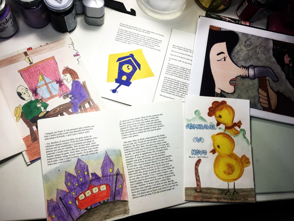 Acima coloco um exemplo. Na imagem, coloquei alguns trabalhos que fiz bem antes de me formar. Um deles, do casal tomando chá, à esquerda, fiz há muitos anos. Mais de vinte anos atrás… Escrevi uma história, ilustrei com caneta Bic e lápis de cor, e mandei para uma editora. Fico feliz que, mesmo tendo sido recusado, não tenham destruído, mas me devolvido, pois agora tenho uma recordação da minha primeira tentativa na área da literatura. Vejam como foi um trabalho até ingênuo, pois não tinha técnica nem nada. E me surpreendo da minha ousadia na época.