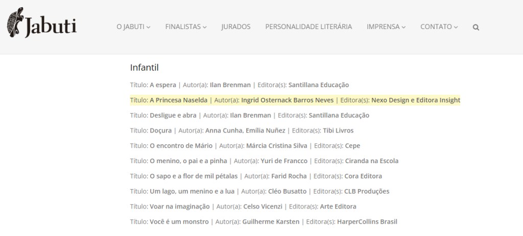 E o meu livro, A Princesa Naselda, ficou entre os 10 finalistas da categoria infantil.